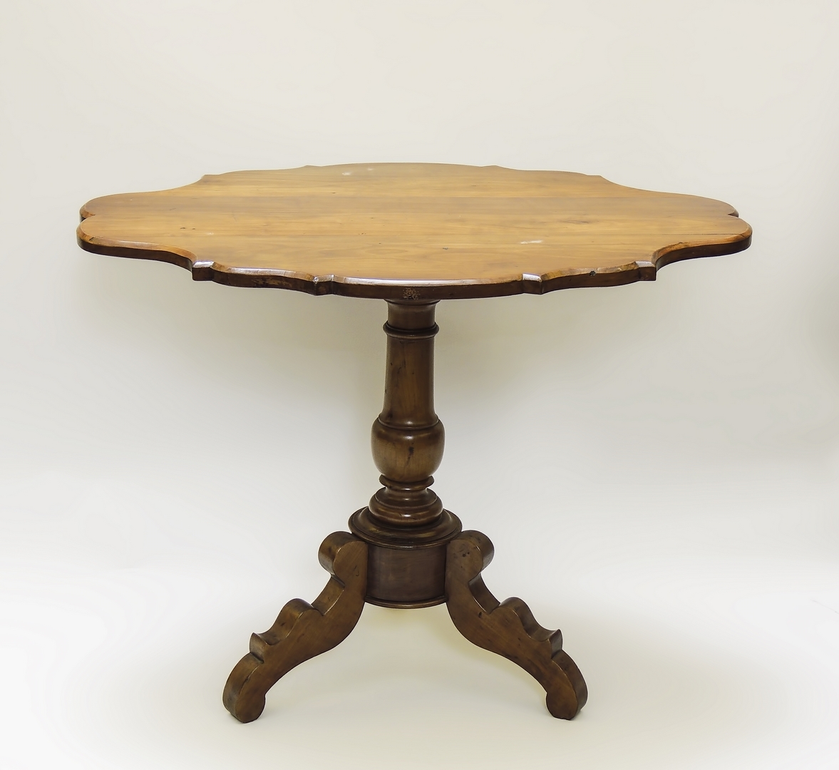 TAVOLINO OVALE DA APPOGGIO IN NOCE seconda metà del XIX secolo piano sagomato, sostegno centrale tornito su tripode h cm 72x95x68