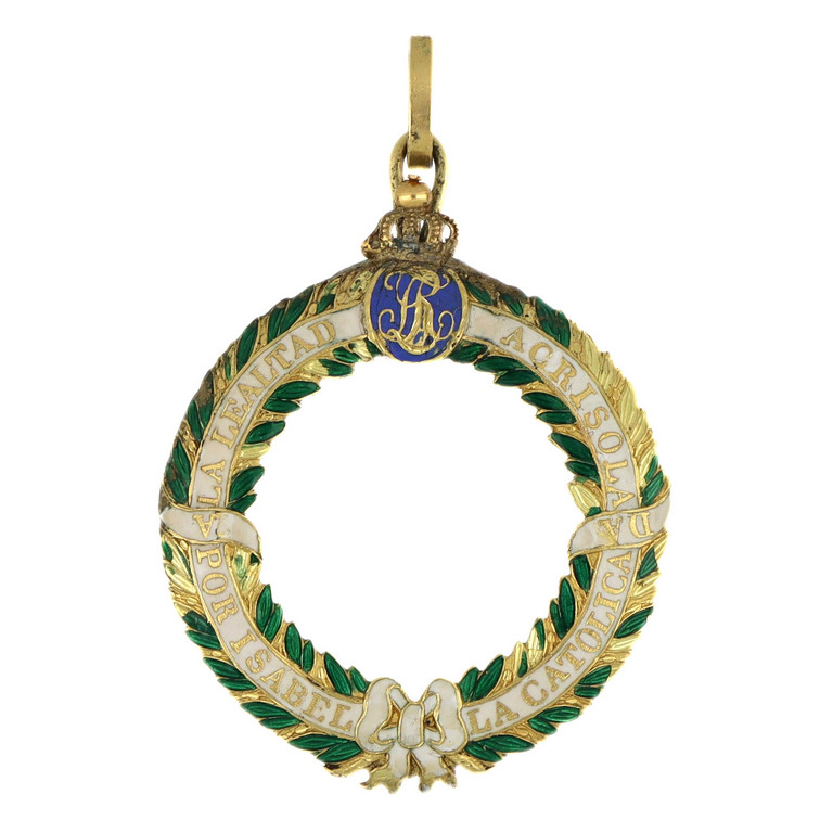 Reliquiario in oro giallo e smalti policromi a guisa di ciondolo apribile con interno visibile.