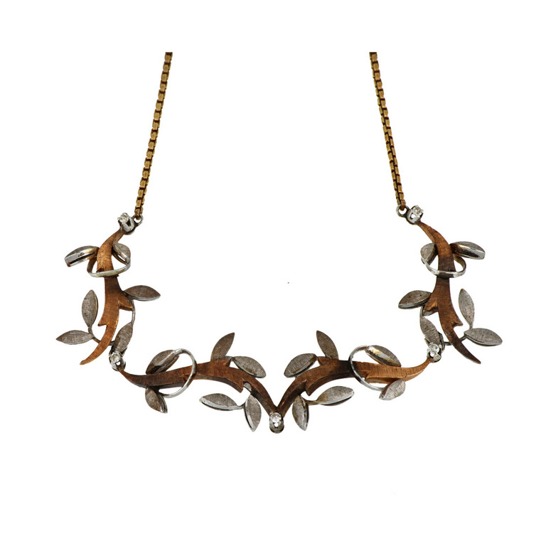 Collana girocollo in oro diversi colori a formare un ramage satinato piccoli diamanti nelle giunzioni.