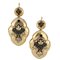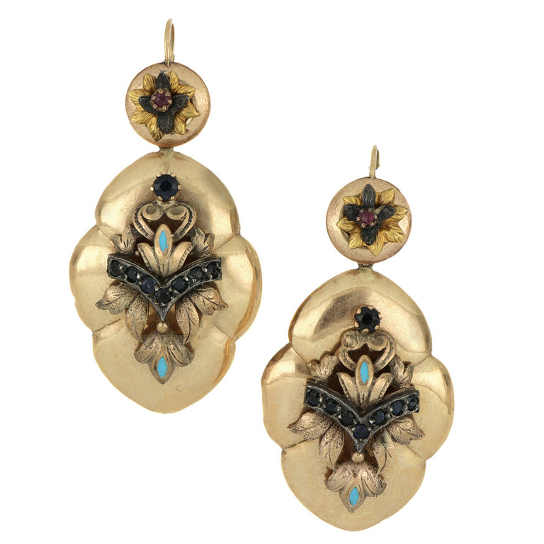 Orecchini in oro rosa 14K realizzati in lastra con montatura a monachella pietre scure e smalti azzurri.