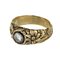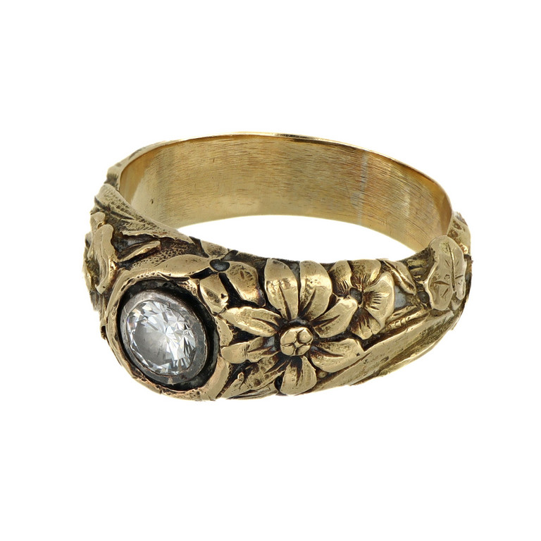 Anello in oro giallo da uomo lavorato a roselline incise sul gambo a fascia ornato al centro da diamante taglio brillante per stimati ct. 0 35.