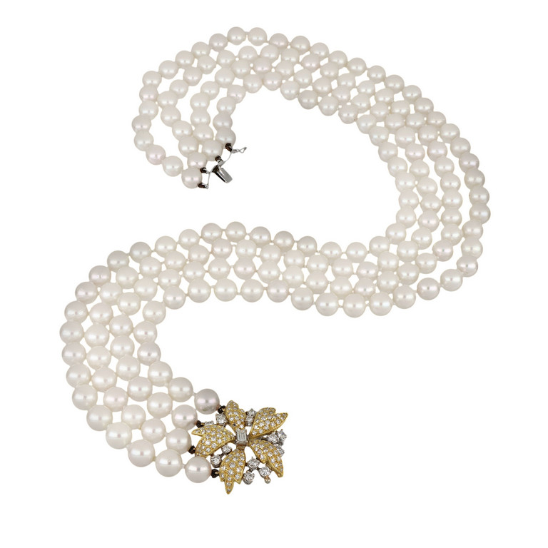 Collana di perle coltivate giappone di 8 mm di diametro composta di quattro fili scalati sul collo e chiusi da una fermezza in oro bianco e giallo a motivo di stella a 5 punte con al centro un diamante taglio rettangolare di stimati ct. 0 25 e interamente pavettata con altri taglio brillante per complessivi ct. 2 50 ca.