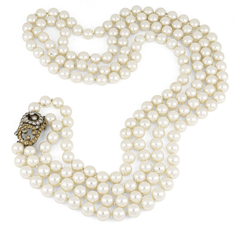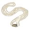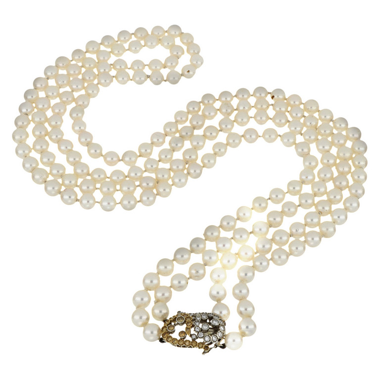 Collana di perle coltivate giapponesi composta di due lunghi fili di 8 / 8 5 mm di diametro e chiusura in oro bianco e giallo impreziosita da diamanti fancy e bianchi taglio brillante per complessivi stimati ct.1 70 ca.