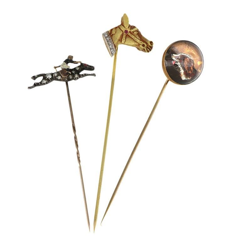 Lotto composto da 3 spille da cravatta di antica fattura in argento e oro una con miniatura una raffigurante cavallo al galoppo con piccoli diamanti taglio rosa e una raffigurante testa di cavallo.