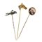 Lotto composto da 3 spille da cravatta di antica fattura in argento e oro una con miniatura una raffigurante cavallo al galoppo con piccoli diamanti taglio rosa e una raffigurante testa di cavallo.