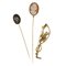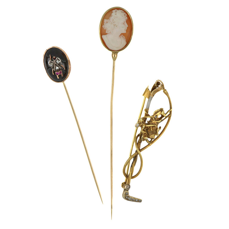 Lotto composto da 3 spille da cravatta in oro di antica fattura una con cammeo una raffigurante una scena equestre ed una con pietra dura e piccola moschina.