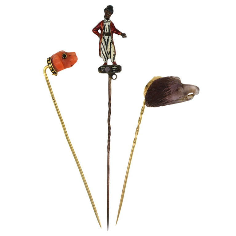 Lotto composto da 3 spille da cravatta in oro di antica fattura una raffigurante moretto veneziano con smalti una con testa di cane in corallo e una con testa di rapace in quarzo inciso.