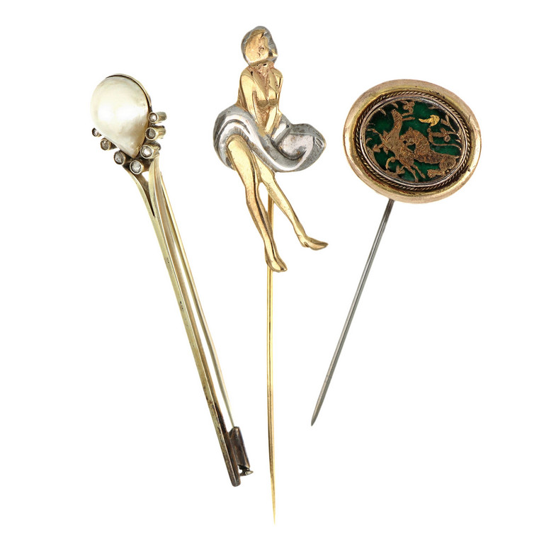 Lotto composto da 3 spille in oro di diverso titolo e colore una con smalto verde una con perla drappata ed una a forma di Marilyn.