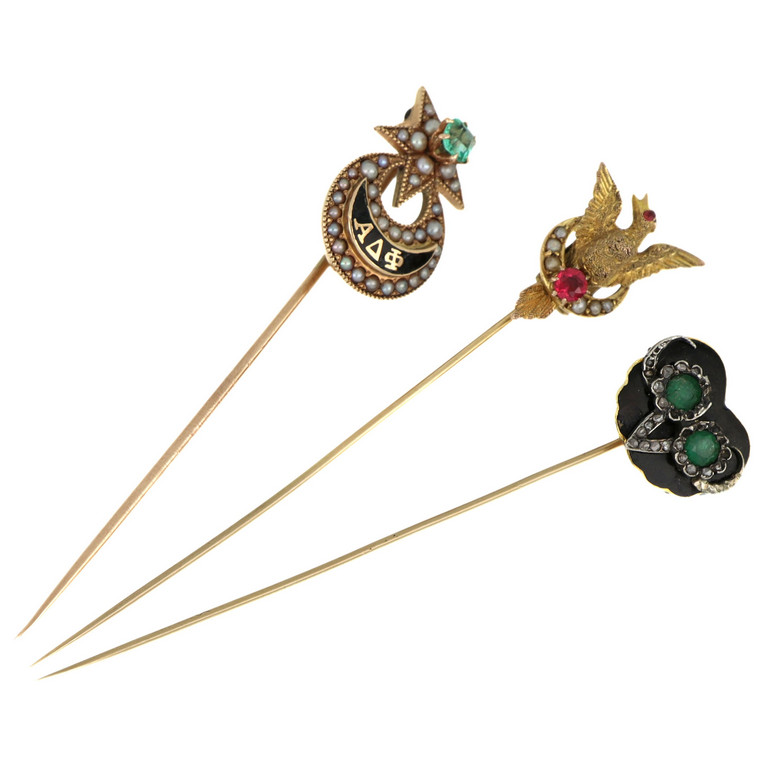 Lotto composto da 3 spille da cravatta in oro di antica fattura una raffigurante testa di civetta una stella a 5 punte con piccolo smeraldo e una raffigurante un uccello con ali spiegate.