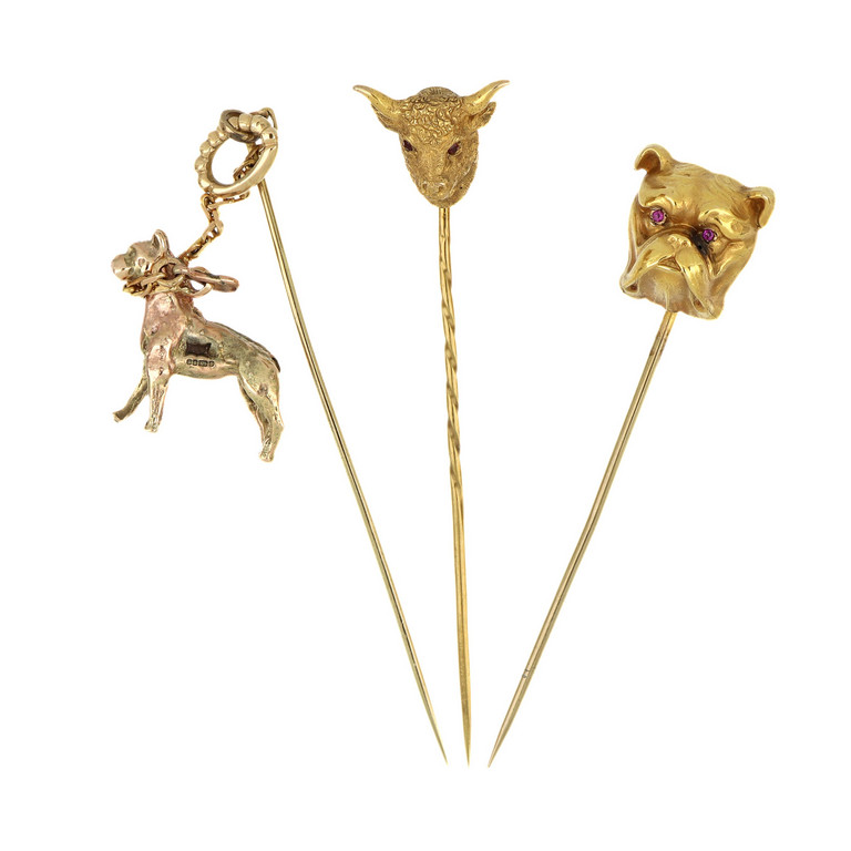 Lotto composto da 3 spille da cravatta in oro una raffigurante cane al guinzaglio una a testa di bulldog ed infine una a testa di bovino.
