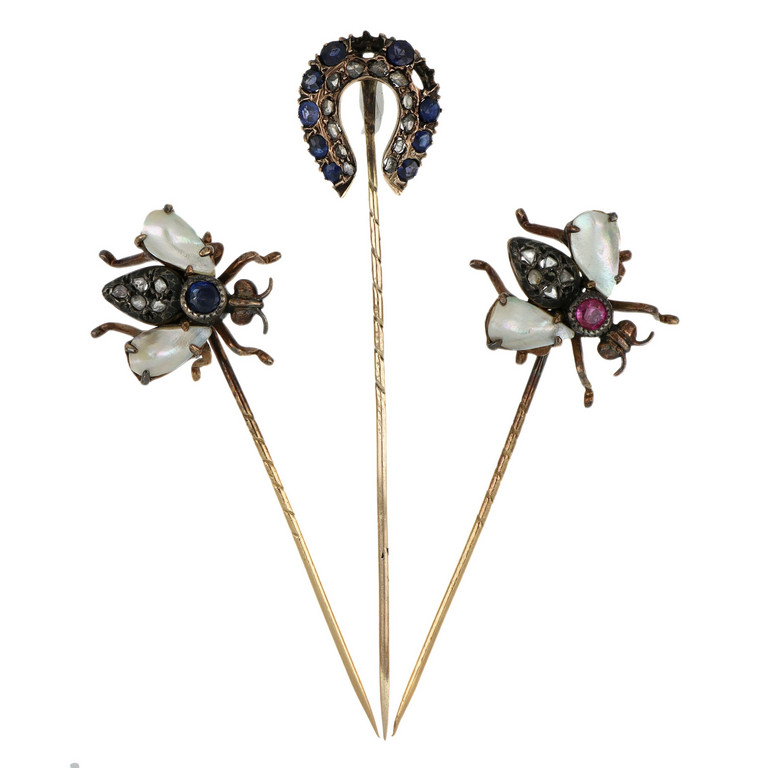 Lotto composto di 3 spille da cravatta antiche in oro rosso e argento con diamanti perle zaffiri e rubini raffiguranti ferro di cavallo e moschine.
