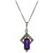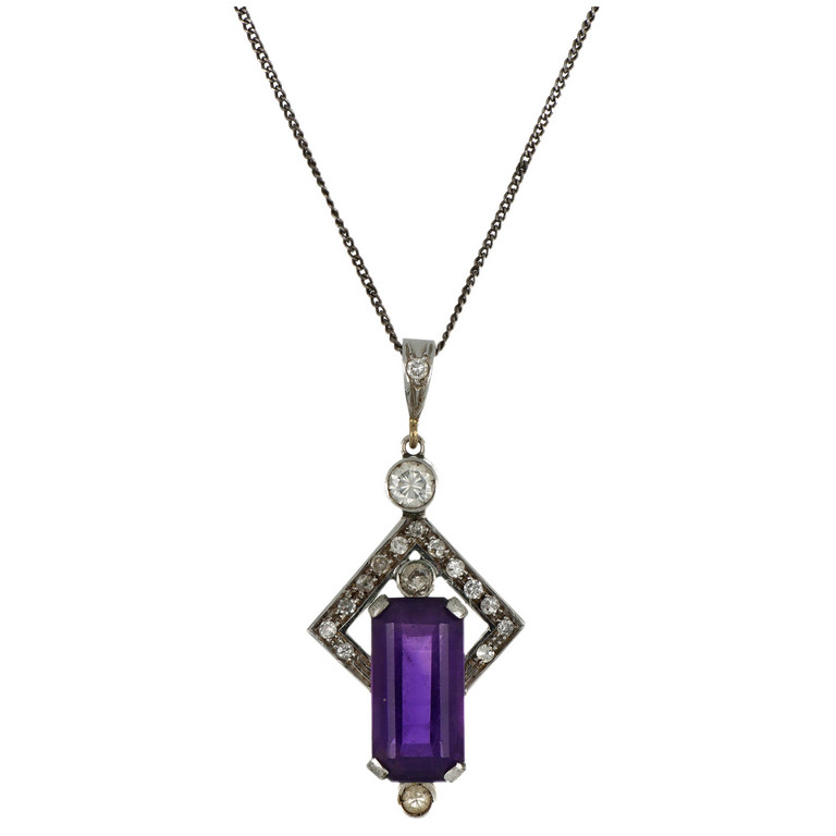 Pendente in oro bianco con grande quarzo ametista e diamanti su disegno geometrico a rombo.