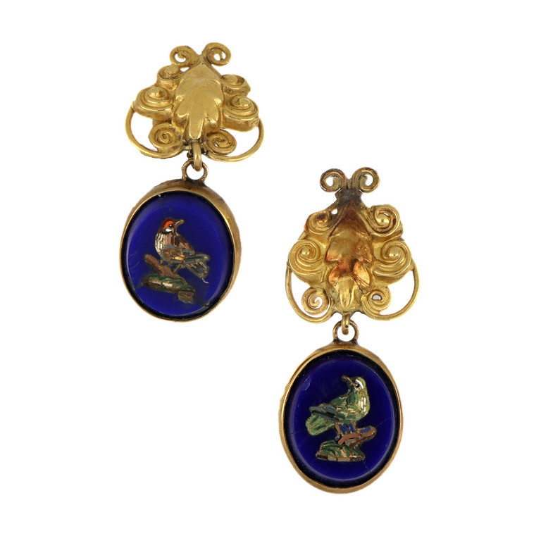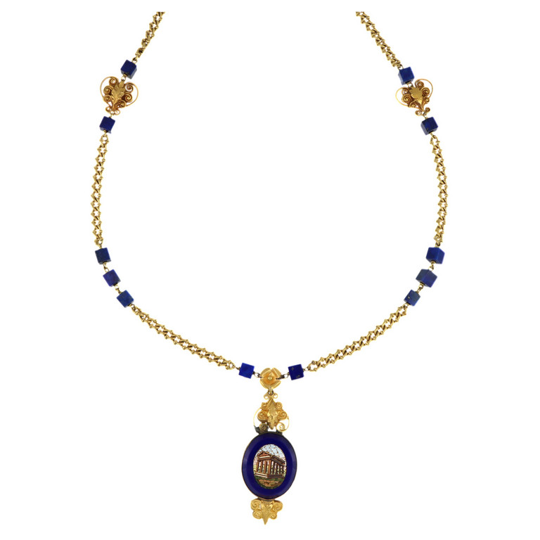 Lunga collana in oro giallo e lapislazuli a cubetto intercalati micromosaico centrale e orecchini in parure.