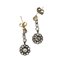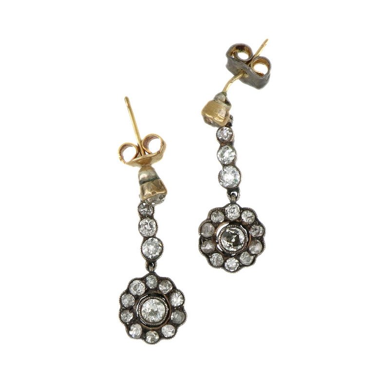 Orecchini in argento ed oro a fiorellini pendenti interamente snodati e realizzati con piccoli diamanti taglio antico per stimati ct. 1 00.