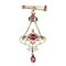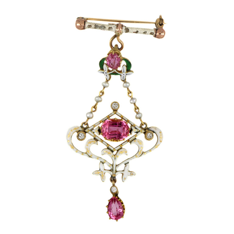 Spilla da cappotto pendente in oro giallo e smalti policromi adornata di tormaline rosa e piccoli diamanti.