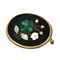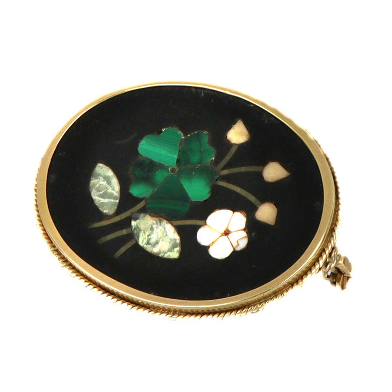 Spilla in oro giallo con grande onice ovale intarsiato con pietre dure.