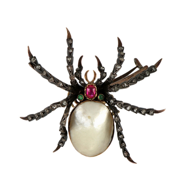Spilla in oro 14k e argento raffigurante grande ragno con zampe incassate con piccoli diamanti e il corpo di perla Mabe'.