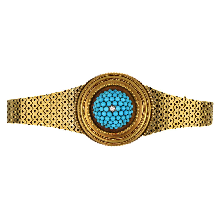 Bracciale in oro giallo in maglia morbida scalare con al centro rosone di turchesi e piccolo diamante.