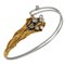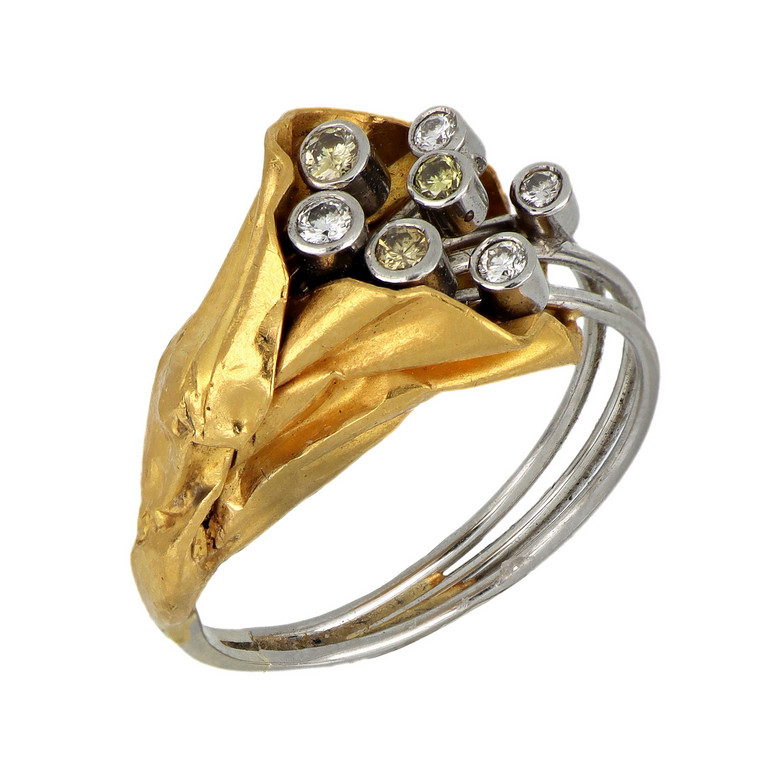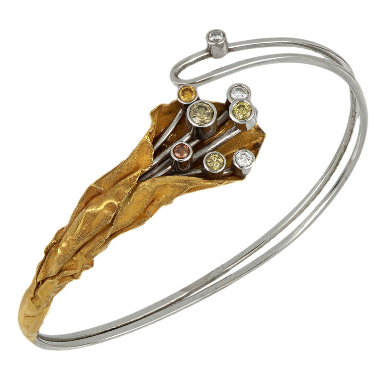 Bracciale e anello in parure realizzati in oro giallo e platino con diamanti colorati a formare cornucopie.