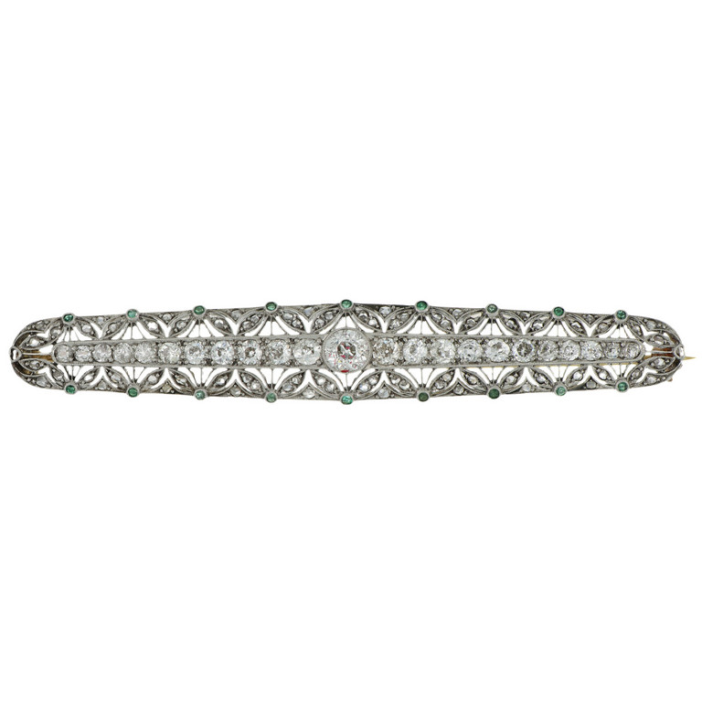 Lunga spilla a 'Barretta' finemente lavorata di epoca primi anni XX secolo realizzata in platino e oro giallo con diamanti taglio old mine e a rosa piccoli smeraldi intercalati a impreziosire il motivo a traforo.