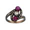 Anello in oro ossidato di foggia antica con due rubini taglio cuscino ai lati di un diamante taglio rosa.
