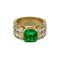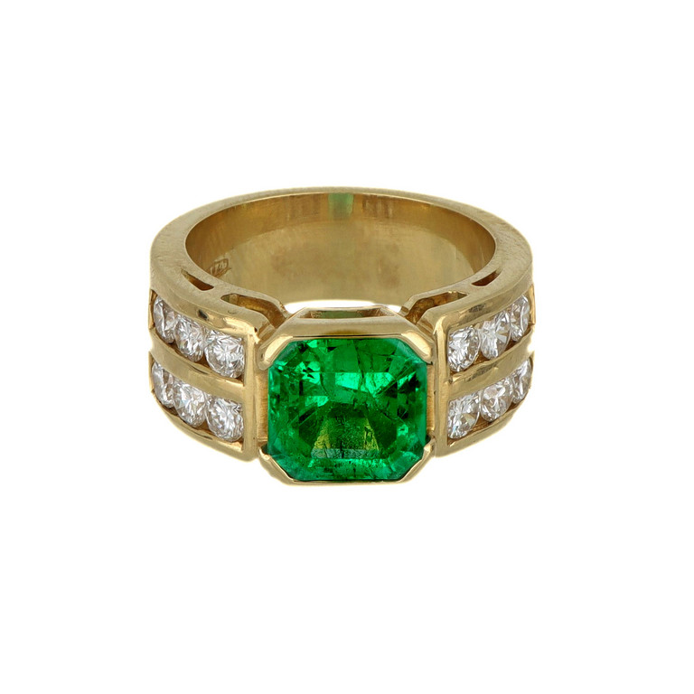 Anello a fascia in oro giallo con smeraldo centrale di taglio quadrato di stimati ct 3 00 e diamanti taglio brillante sul gambo incassati a binario per complessivi ct 1 20 ca.