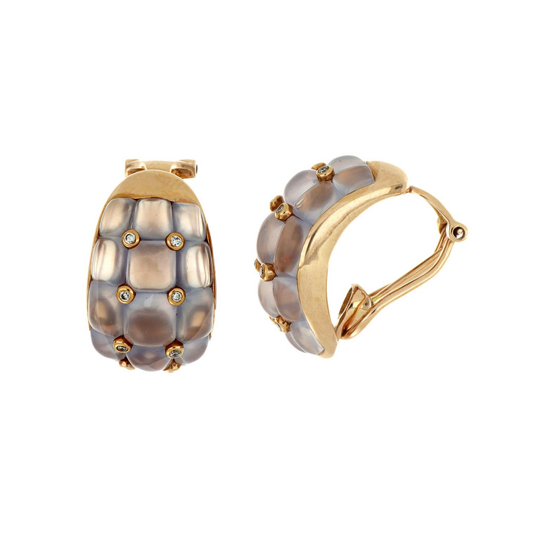 Orecchini in oro rosa con pietre di luna taglio cabochon e diamanti taglio brillante sulle incassature montatura con perno ribaltabile e clips.