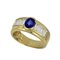 Anello a fascia in oro giallo con al centro zaffiro di stimati ct. 1 00 e a lato 8 diamanti taglio baguette per ct. 0 80 ca.