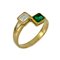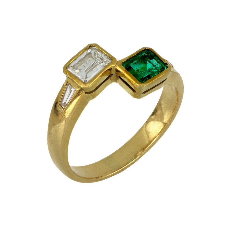 Anello contrarie' in oro giallo con diamante taglio rettangolare e smeraldo per stimati rispettivamente ct. 0 45 e 0 40.