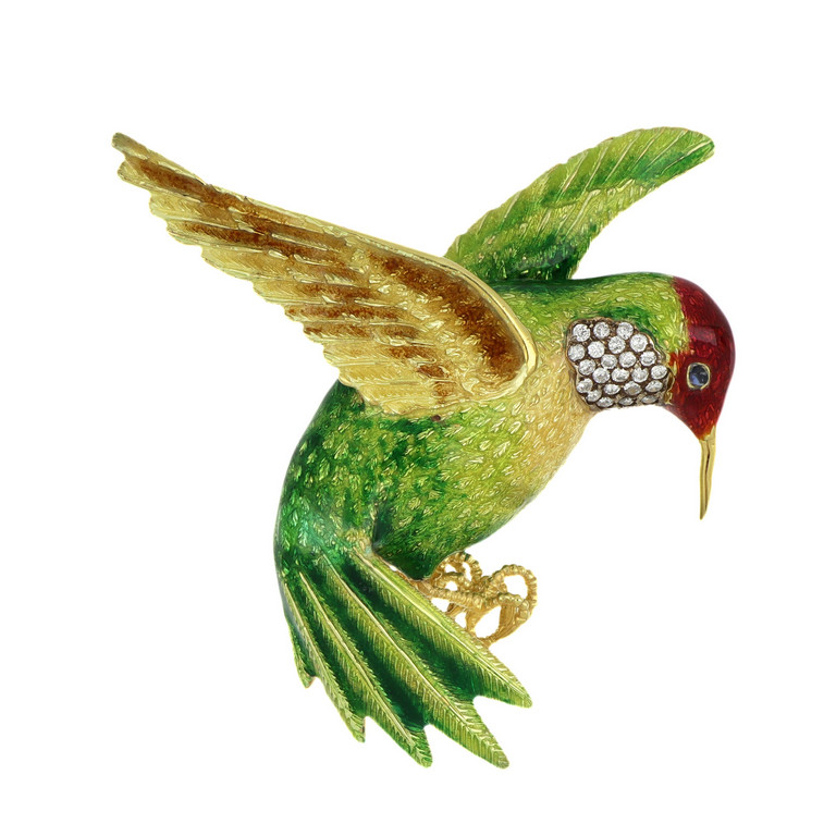 Tiffany spilla in oro giallo e smalti policromi raffigurante Colibri' piccoli diamanti finemente incassati nel collo.