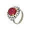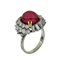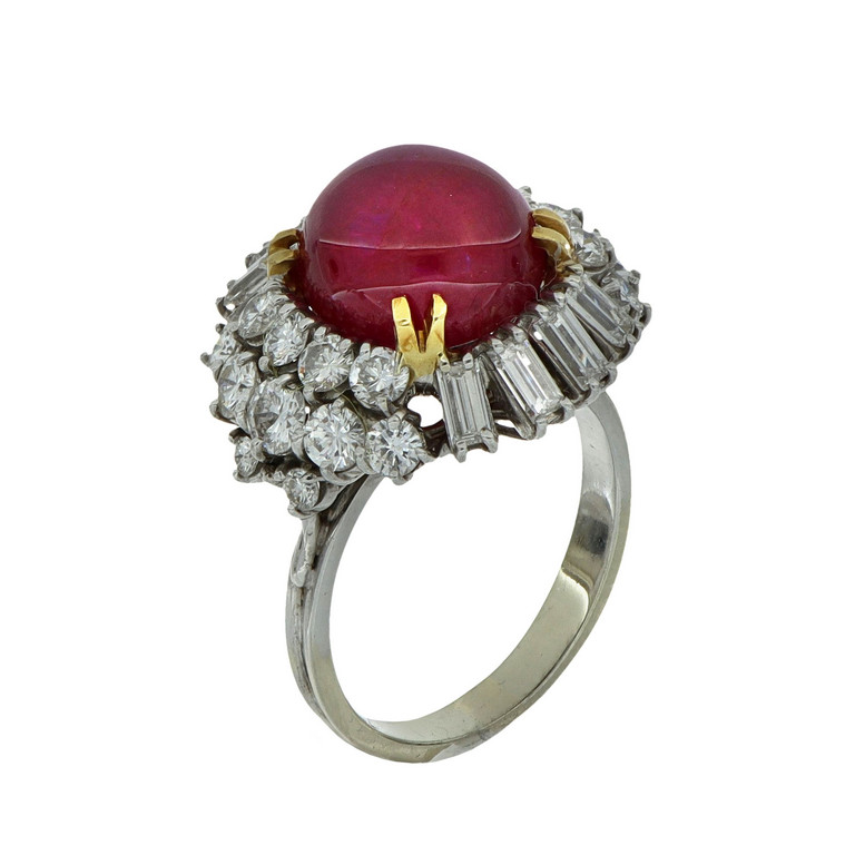 Anello in oro bianco a 'Musone' con al centro rubino taglio cabochon di origine birmana (peso stimato ct.9 78 ca.) senza trattamenti termici come evidenziato dal report GRS allegato e diamanti taglio brillante e baguette a contorno per stimati ct. 2 00 ca.