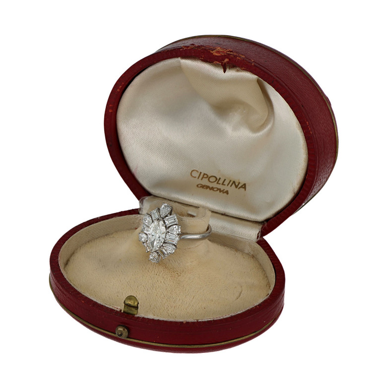 Anello in platino di foggia a Marquise con al centro diamante taglio Navette e altri diverso taglio a contorno per stimati ct.2 00 ca.