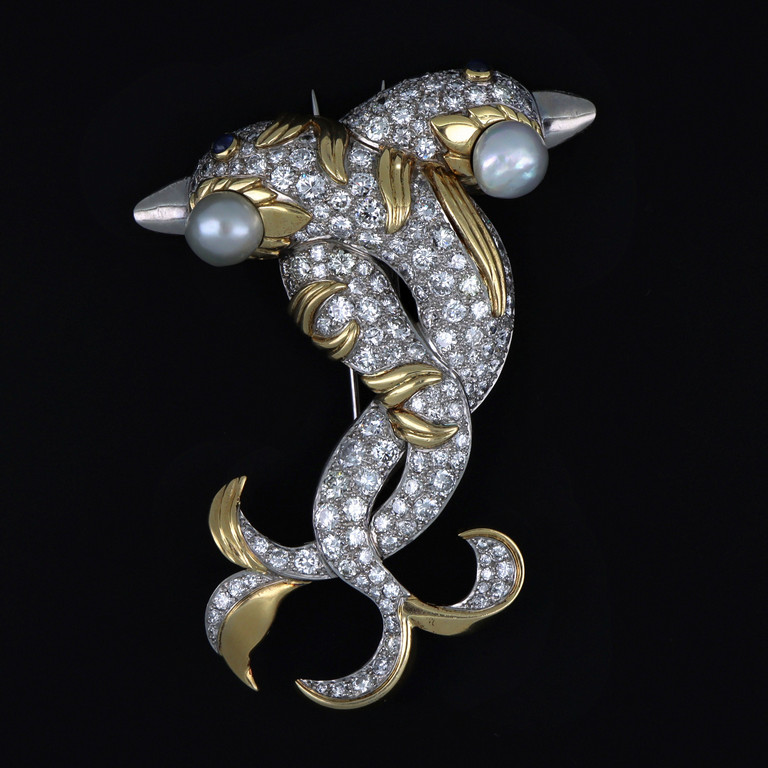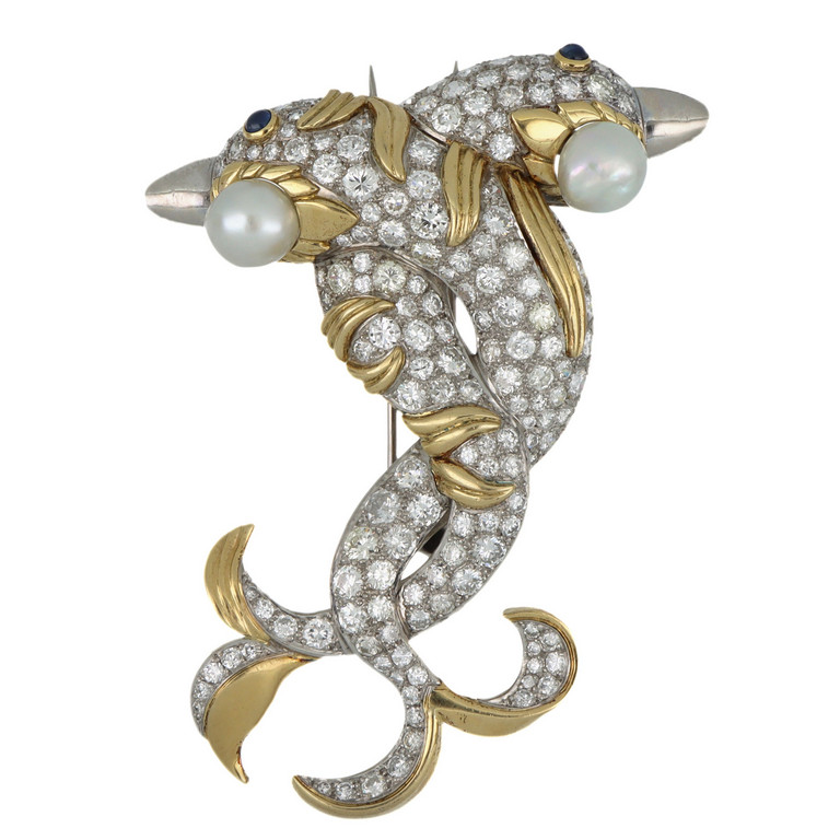 Spilla in platino e oro con firma Maoubussin Paris marchi francesi di garazia del metallo disegnata a raffigurare due delfini incrociati che giocano con due perle sul muso.