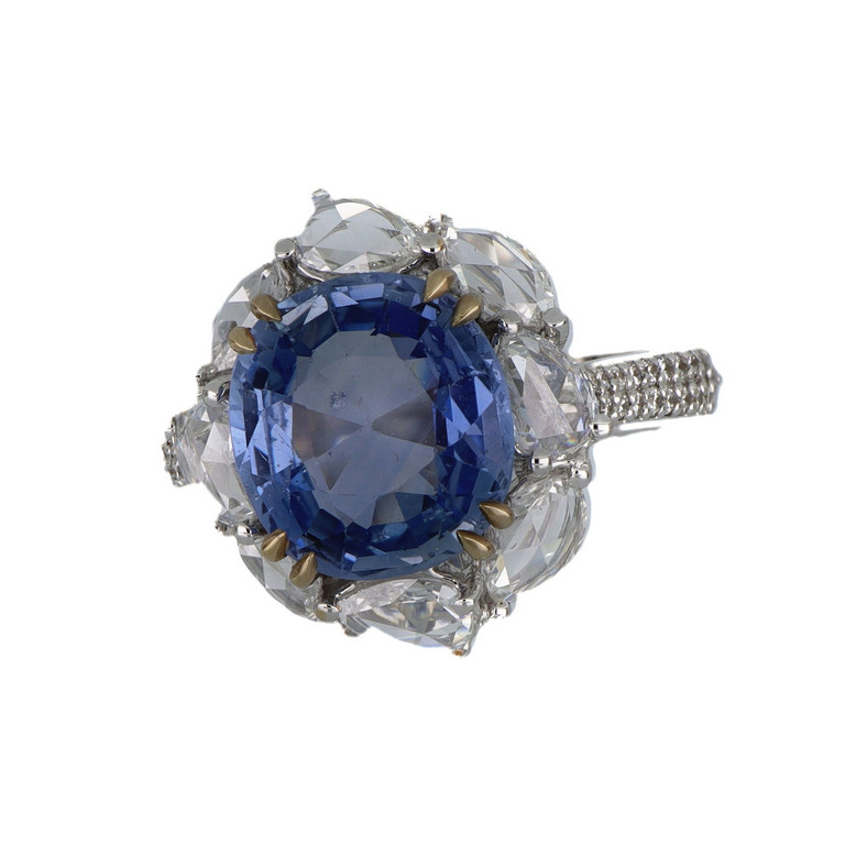 * Anello in oro bianco con al centro zaffiro fiordaliso non scaldato di ct. 4 80 e diamanti a contorno taglio rosa per ct.1 41.