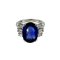 Anello in oro bianco con 6 diamanti taglio baguette per ct 1 00 stimati affiancati a ventaglio di un grande zaffiro ovale di stimati ct. 8 00.