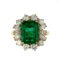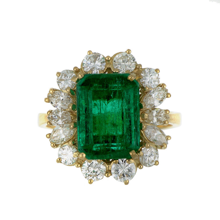 Anello in oro giallo con diamanti di vario taglio per stimati ct.1 90 a contorno di uno smeraldo colombiano taglio rettangolare di ct. 3 60 ca.