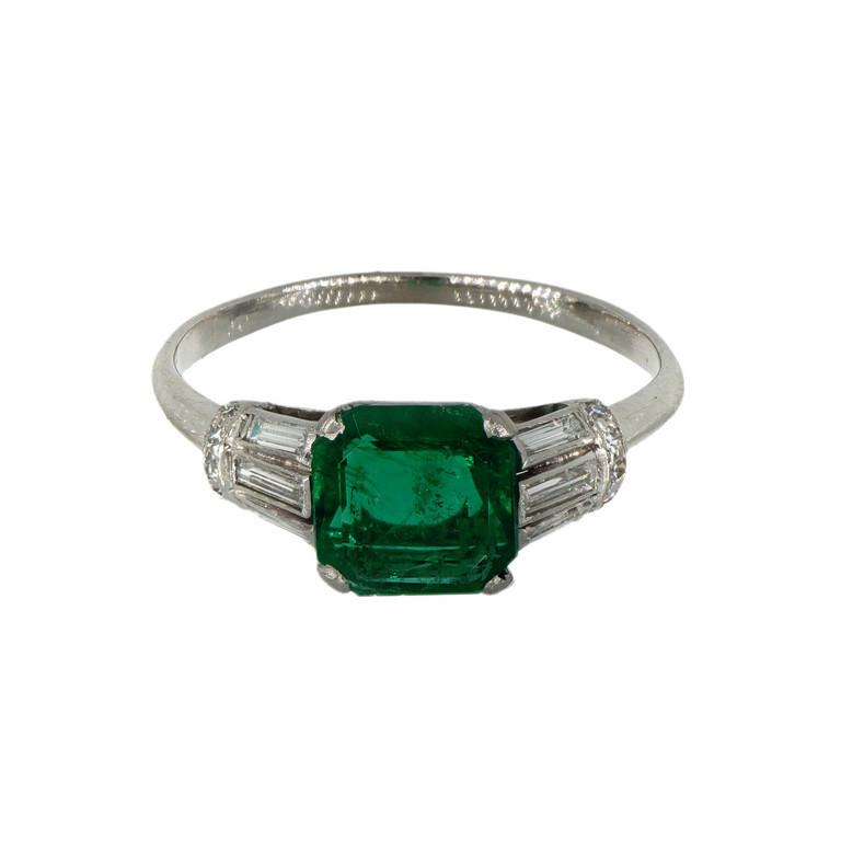 Anello in platino di antica fattura con fine smeraldo di ct. 1 20 e sei diamanti taglio baguette ai lati punzone del gioielliere (H-W) Herry Winston punzone di garanzia del metallo.