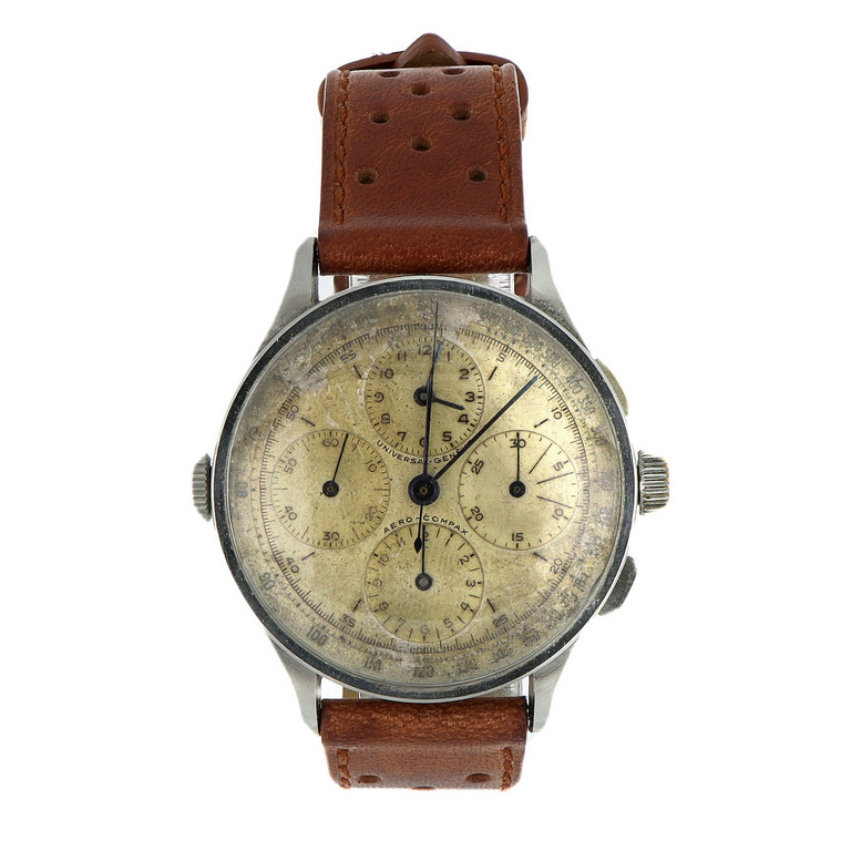 Universal Geneve raro orologio da uomo modello 'Aerocompax' in acciaio e cinturino in pelle diametro cassa 38 mm.