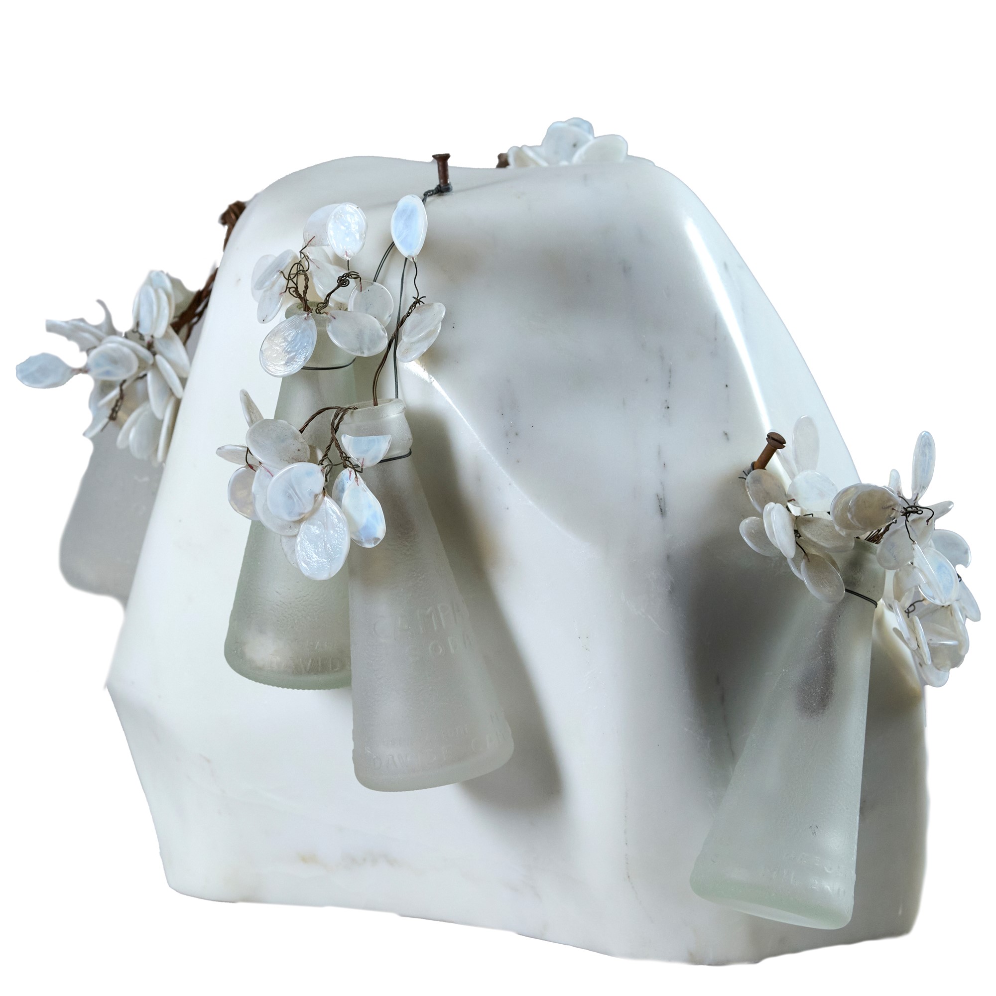 Scultura in marmo, vetro e viti di ferro cm. 35x35x21