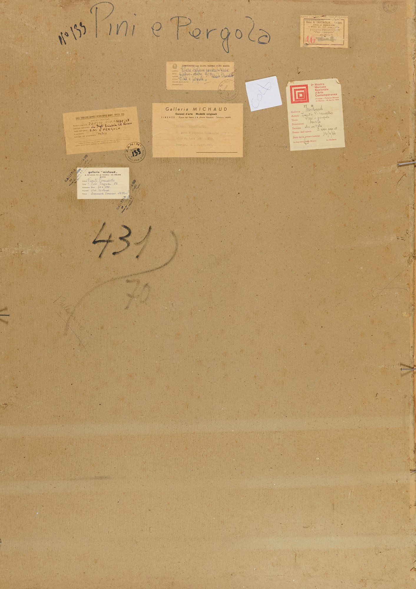 Etichetta: "Soprintendenza alla Galleria Nazionale d'Arte Moderna, Mostra Pittura italiana Contemporanea", Roma, giugno - ottobre 1958.