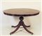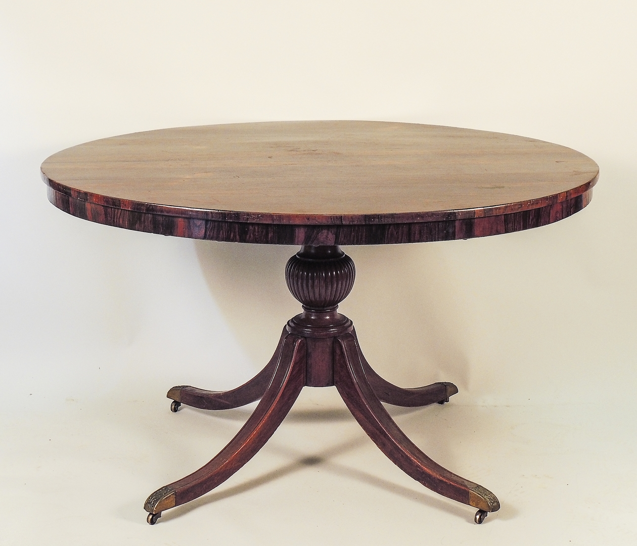 TAVOLO TONDO A VELA IN PIUMA DI NOCE Inghilterra, fine del XIX secolo sostegno baccellato su quattro gambe a sciabola con piedini in bronzo con rotelle h cm 75, diam 130 E' corredato da due tipologie prolunghe per trasformarlo in un tavolo ovale di due dimensioni e una per uno tondo più grande