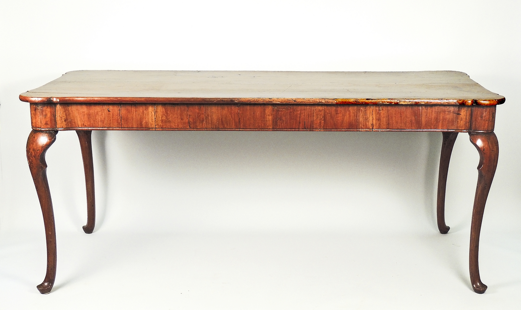 TAVOLO DA PRANZO IN NOCE XIX secolo piano sagomato, gambe mosse con attacco sagomato, piedini a ricciolo stilizzato h cm 79x189x30