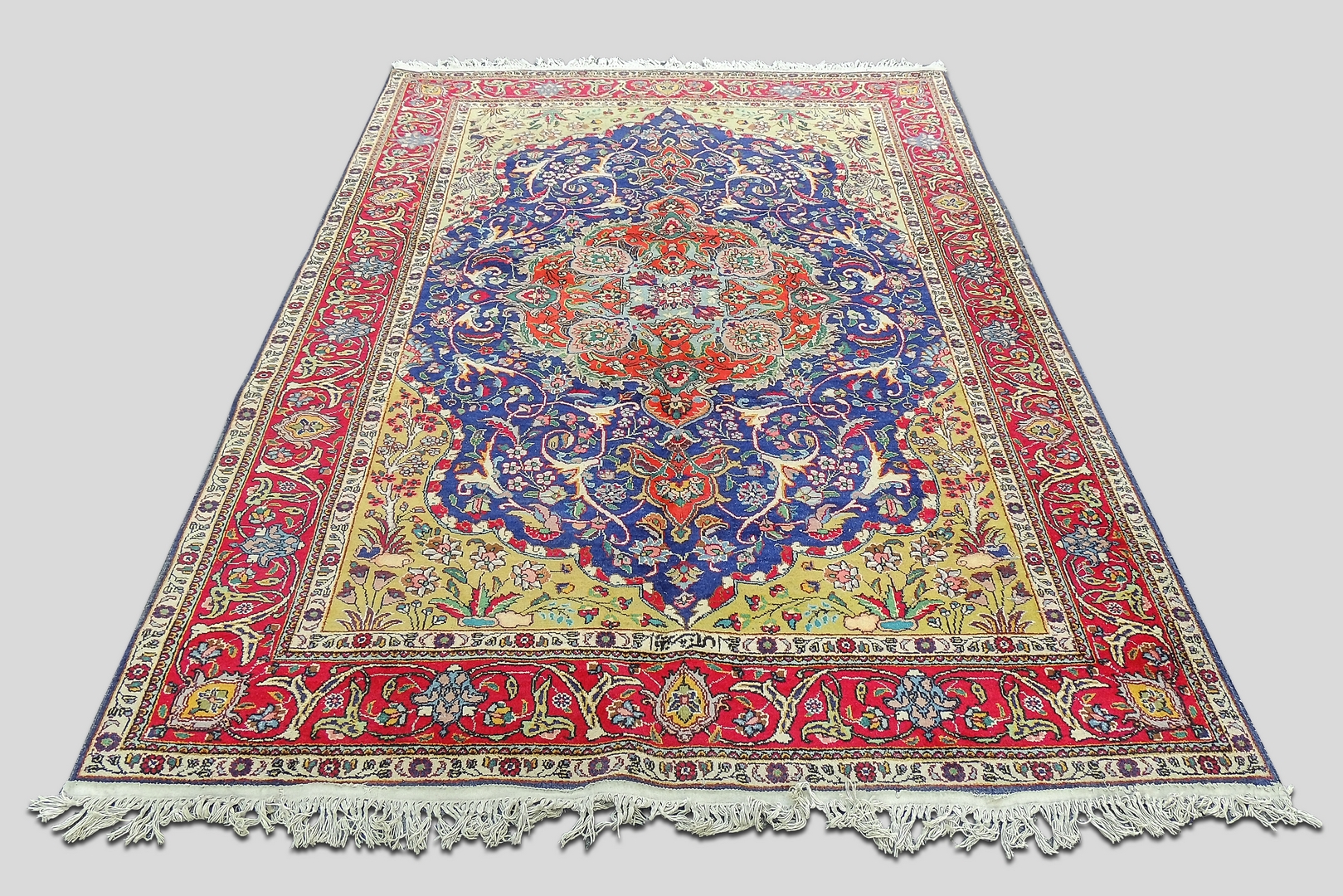 TAPPETO PERSIANO fondo blu, campo con medaglione centrale nei toni del rosso,...