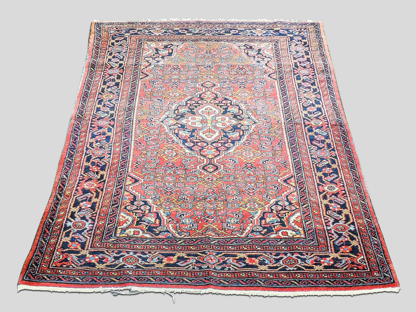 TAPPETO PERSIANO fondo rosso, campo con medaglione centrale e motivi floreali stilizzati, bordura blu scura cm 210x135