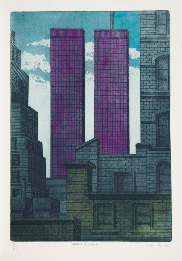 TONINO CAPUTO(LECCE 1933)'Twin Towers'acquaforte acquatinta colorata a manoesemplare n. 85/150cm 51x35firmata in basso a destranumerata in basso a sinistraal retro: Certificato d'autenticita' a cura di 'Bora Edizioni'