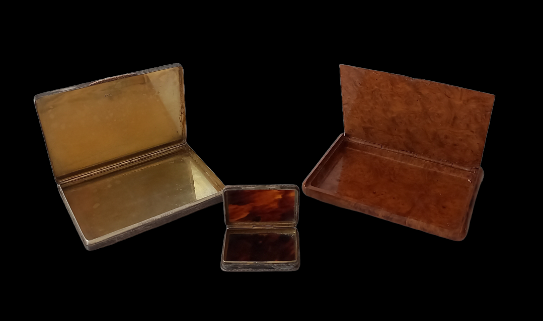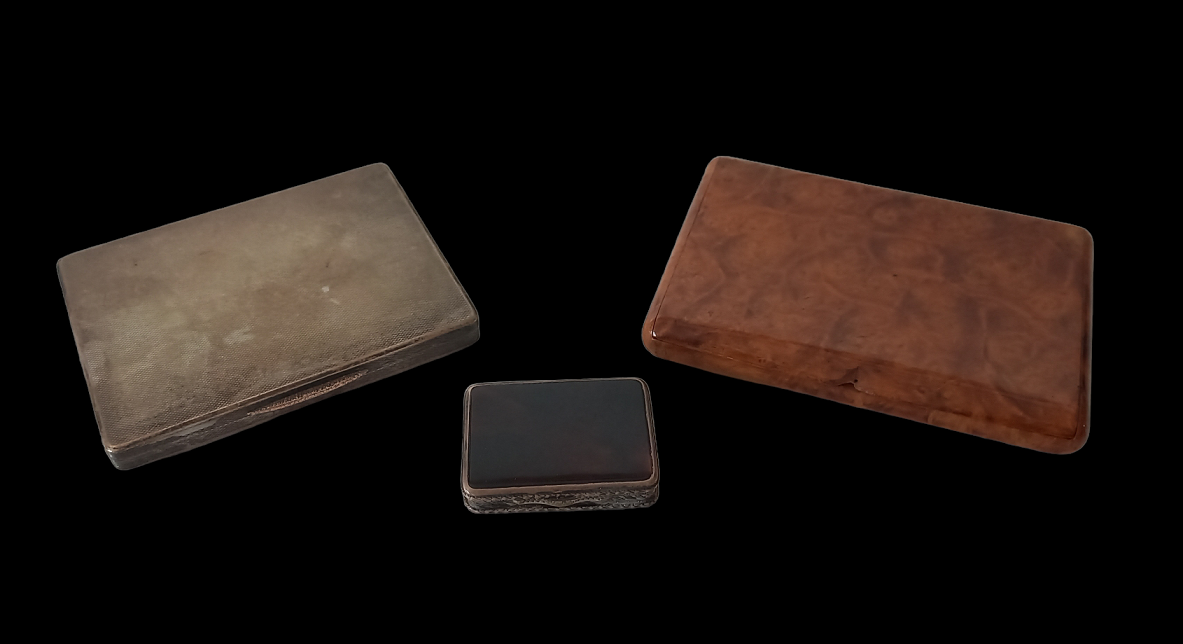 Due portasigarette vintage di cui una in metallo e una in radica ed un portapastiglie in metallo e finta tartaruga