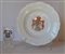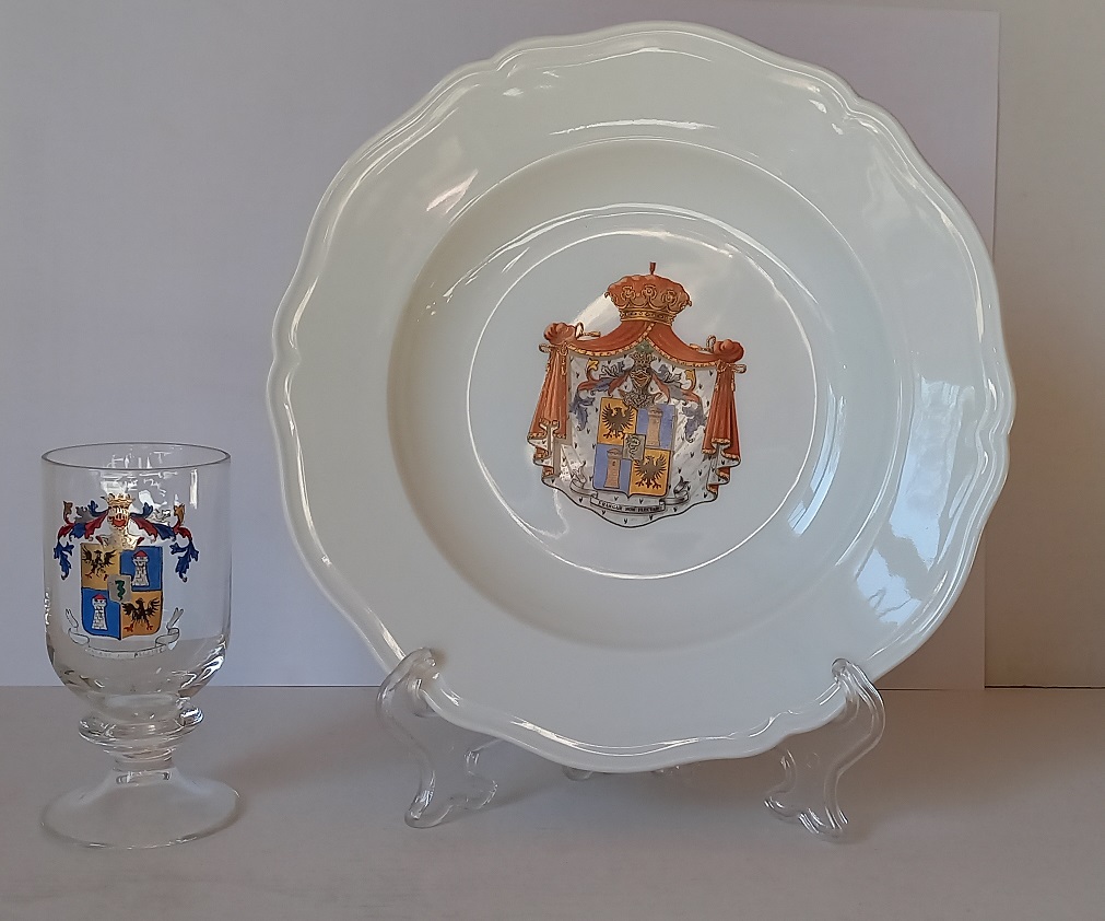 Piatto in porcellana Richard Ginori recante nel cavetto stemma delle famiglie Sforza e Visconti e bicchiere con il medesimo stemma dipinto a mano