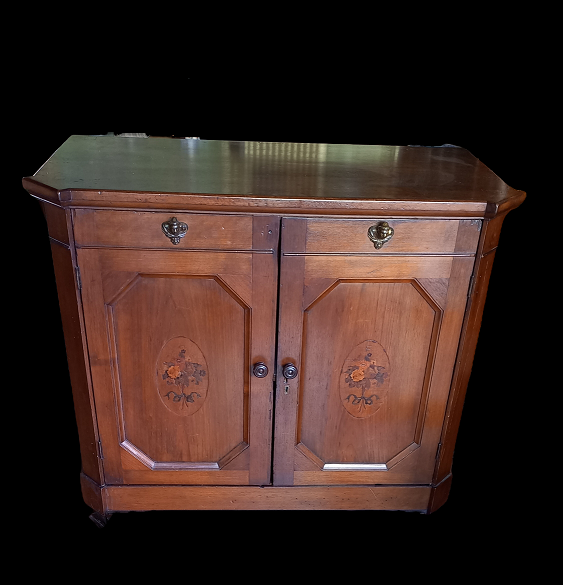 Credenza in legno di noce a due ante decorate con fiori e due finti cassetti...