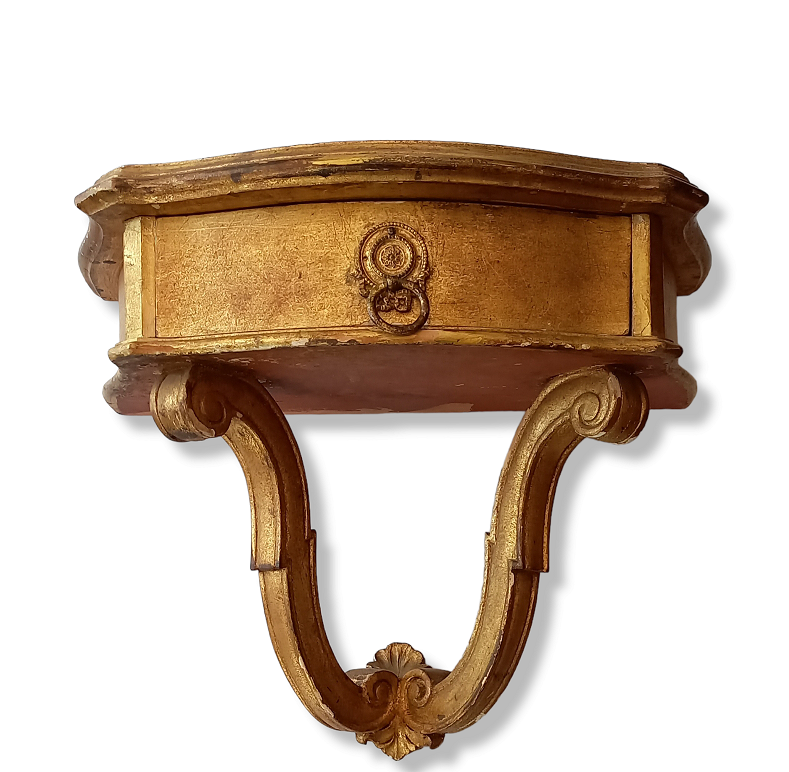 Piccola console da appendere di forma mossa in legno intagliato e dorato e...