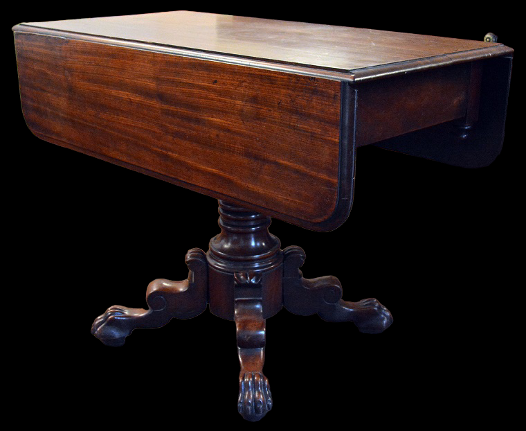 Tavolino a bandelle in legno di mogano a gamba centrale e con cassetto cm.100x50 chiuso h.cm.72 - XIX secolo